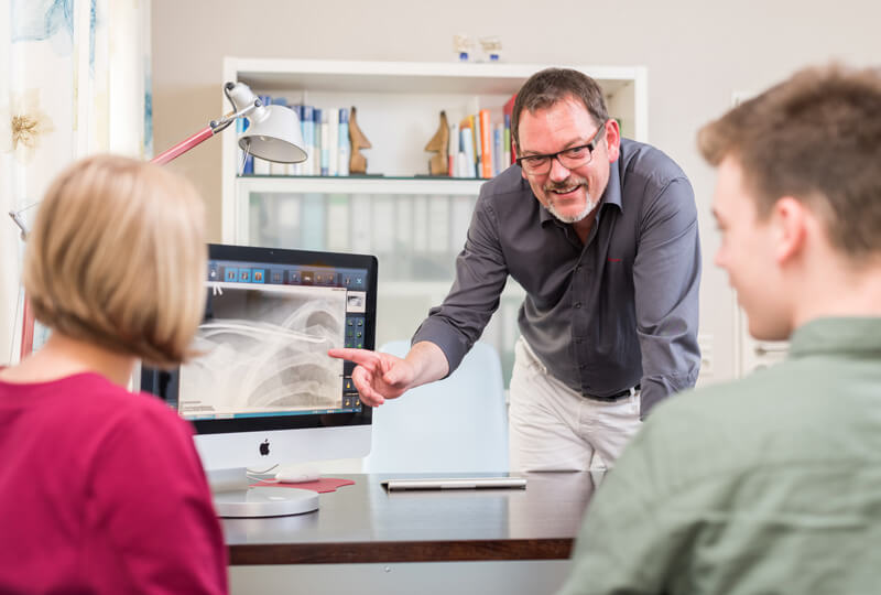 Mit Sicherheit mehr Klarheit: Digitales Röntgen liefert uns Ärzten eine exzellente Bildqualität, mit der wir eine noch schnellere und noch präzisere Diagnose stellen können. Dabei spielt auch die Gesundheit unserer Patienten eine wichtige Rolle, denn die Strahlenbelastung beim digitalen Röntgen fällt deutlich geringer aus als bei konventionellen Röntgen-Aufnahmen. Praktisch ist diese moderne Technik auch noch: Die Archivierung der digitalen Aufnahmen ist enorm platzsparend und umweltschonend, und Digitalbilder können unserem Patienten einfach mitgegeben werden.