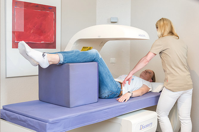 Gut gerüstet gegen Knochenschwund: Bei der Behandlung der Volkskrankheit Osteoporose (Knochenschwund) gibt eine Knochendichtemessung Auskunft über die Struktur und Festigkeit des Knochens. Wir setzen mit dem DXA-Verfahren eine der exaktesten und international anerkanntesten Messmethoden ein, bei dem eine nur sehr geringe Röntgenstrahlung den Körper des Patienten durchdringt, um den Mineralgehalt der Knochen zu bestimmen. Für den Patienten bedeutet das eine schnelle und schmerzlose Untersuchung ohne Nebenwirkungen, mit zuverlässigen Messergebnissen und minimalster Strahlenbelastung.